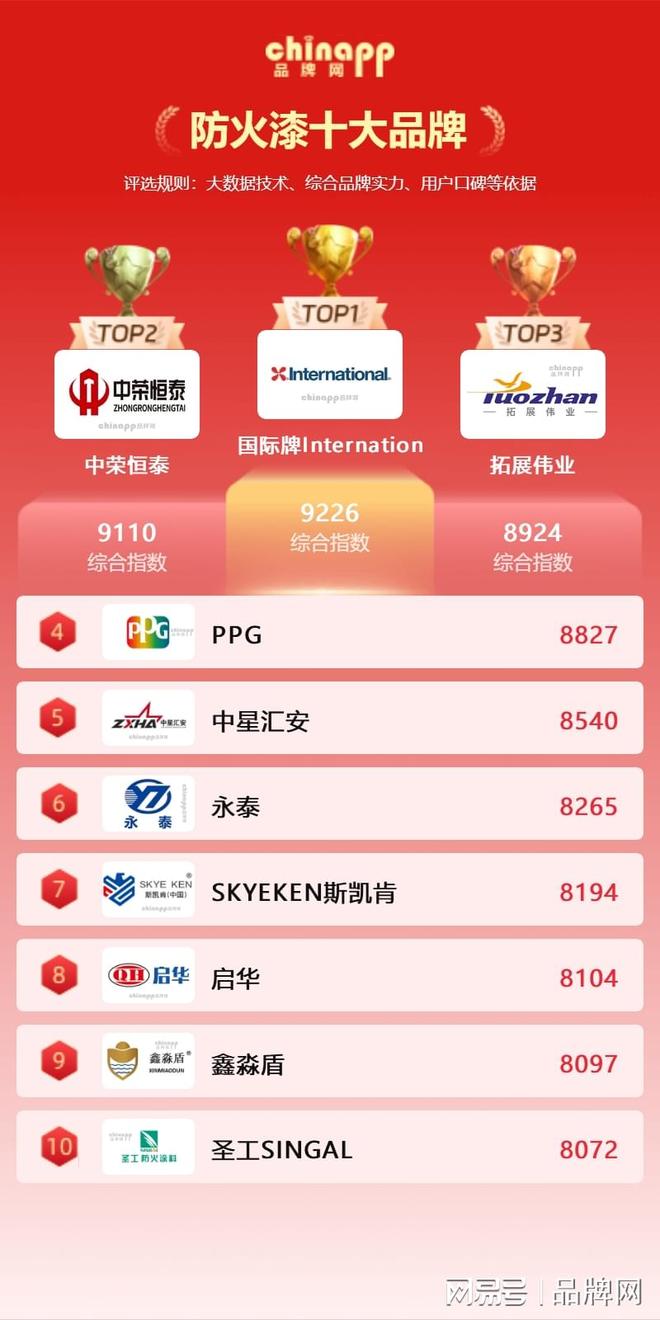 防火漆十大品牌排行榜,防火漆十大品牌前十名分别是:国际牌International、中荣恒泰、拓展伟业、PPG、中星汇安、永泰、SKYEKEN斯凯肯、启华、鑫淼盾、圣工SINGAL 。
