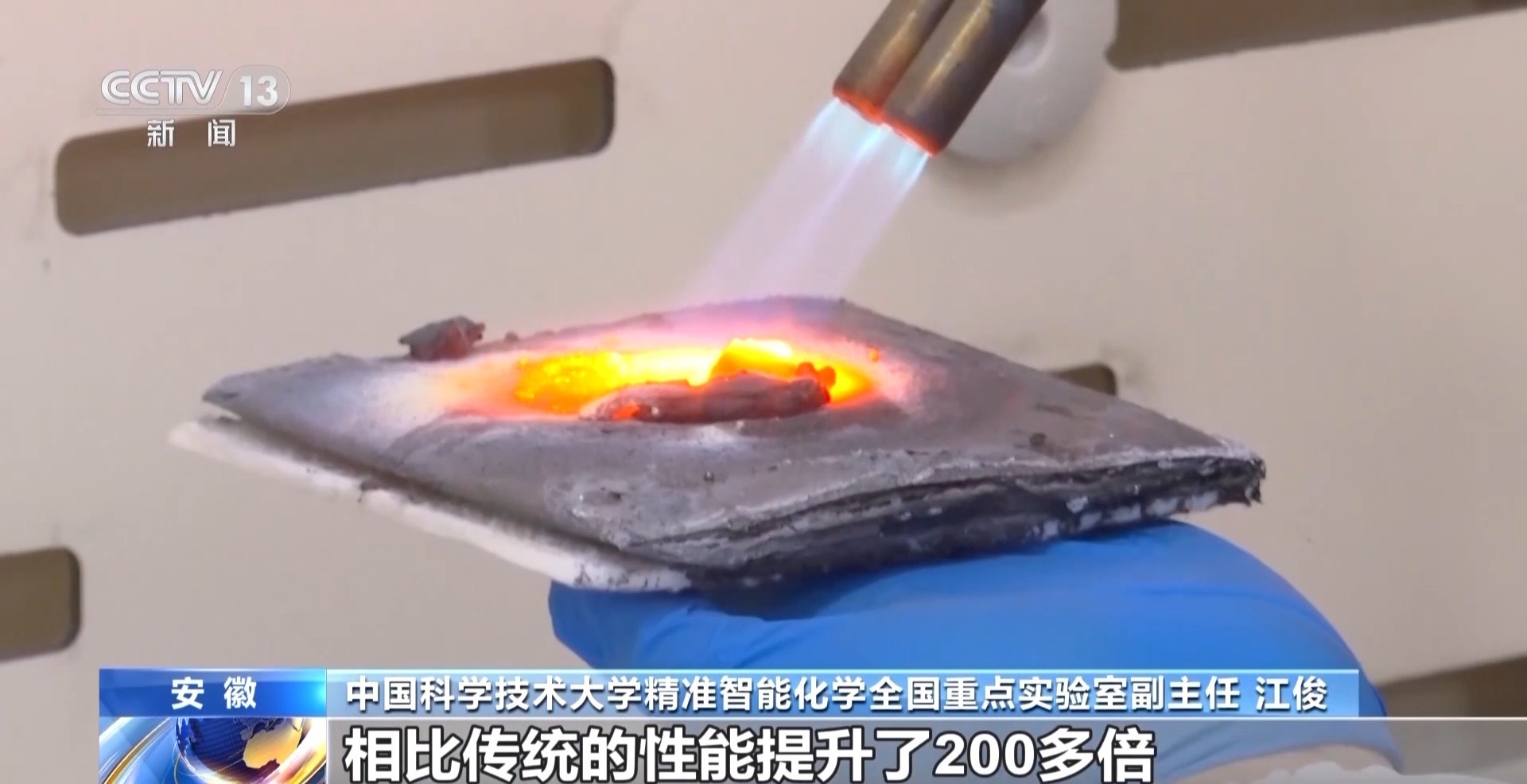 中国科学技术大学精准智能化学全国重点实验室副主任 江俊:大致4个月我们就把材料筛选出来了,目前这个防火阻燃材料相比传统的性能提升了200多倍,比如说我们传统的防火阻燃材料在1400℃高温下面,3毫米的材料只能坚持约30秒,但是我们可以做到几十分钟。