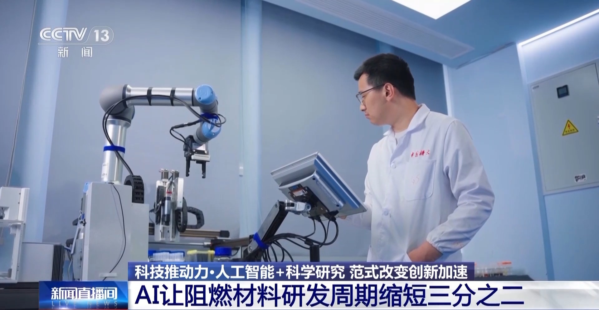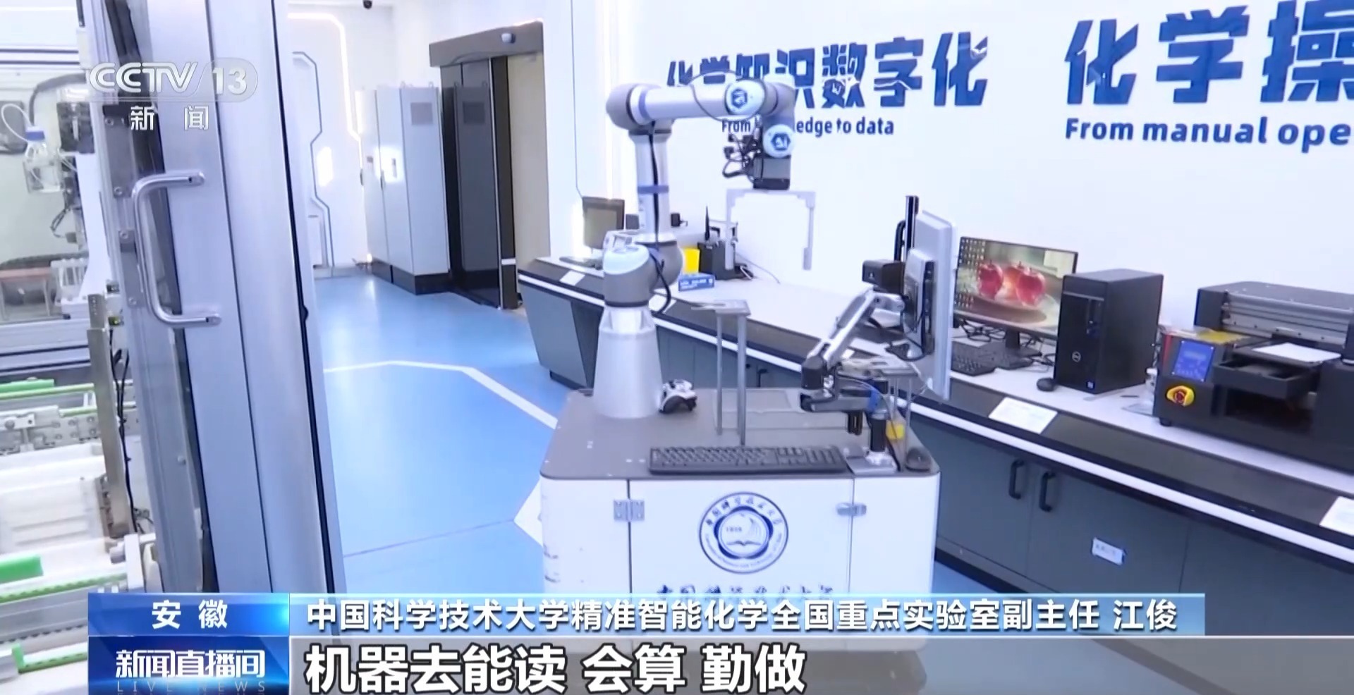 总台央视记者 帅俊全:和我们印象中的很多化学实验室的瓶瓶罐罐不一样,我现在所在的这个化学实验室明显要感觉更加现代化和未来感,因为它叫精准智能化学实验室,比如说我旁边的一个机械臂装置,就是这里的第一代机器化学家“小来”,它的机械臂可以精准操控,和众多智能化平台进行交互,更为关键的是在它的底层,有大量的数据和科学大脑可以提供科研智慧。